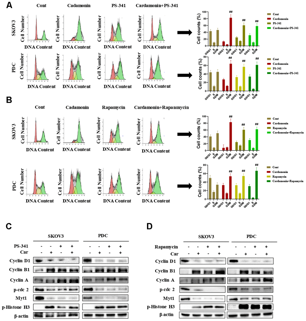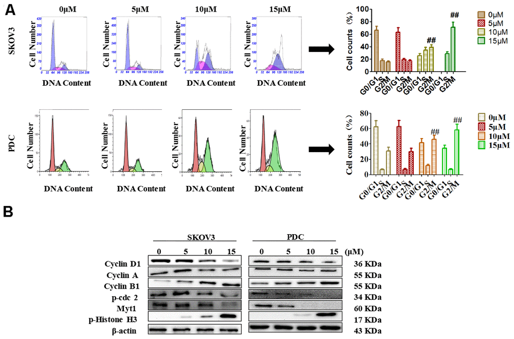 Recent studies have shown that cardamonin induces cell cycle arrest through modulation of cell cycle regulators in ovarian cancer. In this study, we determined cell cycle changes of SKOV3 and PDC cells after treatment with cardamonin. As shown in Figure 3, we found that treatment with cardamonin induced a significant increase of the percentage of cells at the G2/M phase in both SKOV3 and PDC groups.