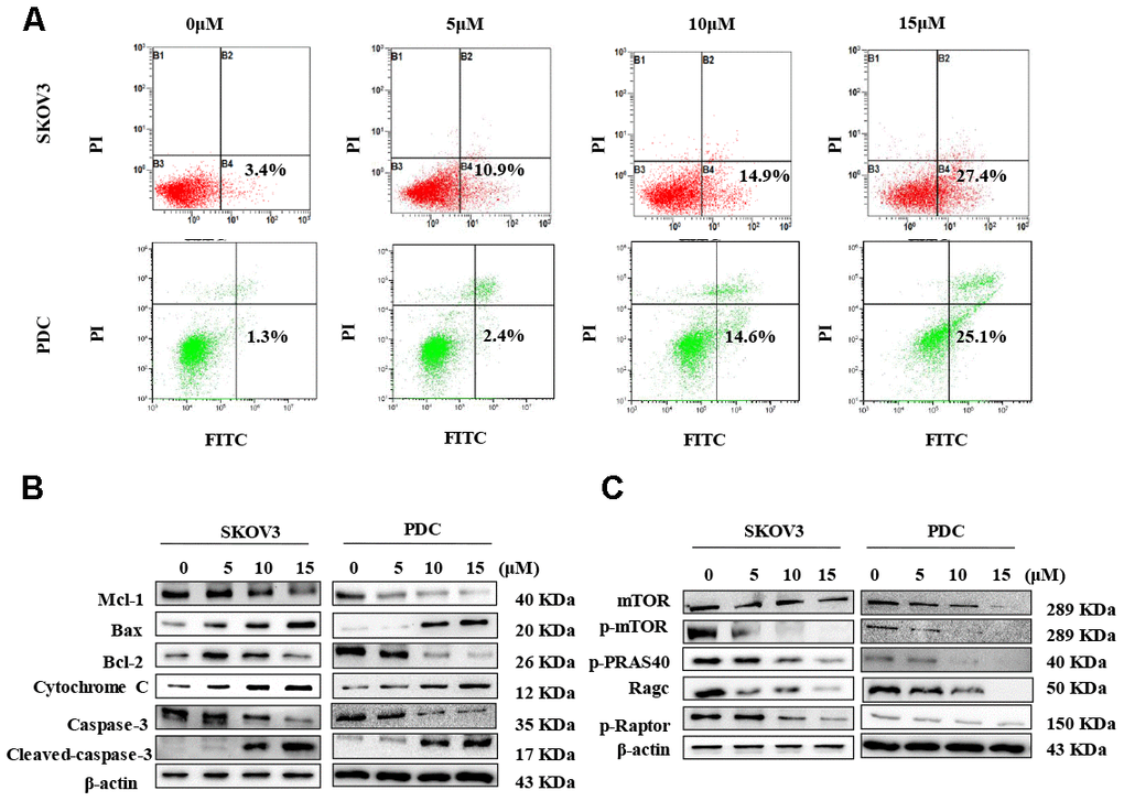 To gain further insights into the molecular mechanisms underlying the cardamonin-mediated decrease in viability, we investigated the expression and phosphorylation patterns of mTOR, p-PRAS40, p-Raptor and Rag in SKOV3 and PDC cells. Our data showed significant cardamonin-induced reduction of p-mTOR, p-PRAS40, p-Raptor and Ragc levels (Figure 4C). Since Raptor and PRAS40 are the specific components of mTORC1, we treated cells with cardamonin and a mTOR inhibitor, rapamycin. We found that rapamycin and cardamonin showed similar effects on apoptosis (Figure 7B), cell cycling (Figure 6B) and the protein expression patterns in cells (Figures 6D, 7D). Of interest, we also observed that the treatment with rapamycin diminished the effects of cardamonin on apoptosis induction and cell cycle arrest, which strongly suggested the involvement of mTOR signaling in the cardamonin acting pathway.