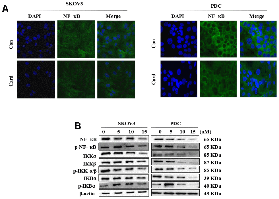 NF-κB and mTOR are well-known promising therapeutic targets for cancer [40, 41]. Accordingly, we focused on whether cardamonin induces apoptosis in ovarian cancer through effects on the mTOR and NF-κB pathways. Interestingly, these pathways were inhibited in SKOV3 and PDC cells subjected to cardamonin treatment. Although this is not the first study to show that cardamonin suppresses mTOR and NF-κB signaling, to our knowledge, cardamonin-mediated reduction of mTOR and NF-κB levels in PDC as a potential anti-tumor mechanism has been demonstrated for the first time.