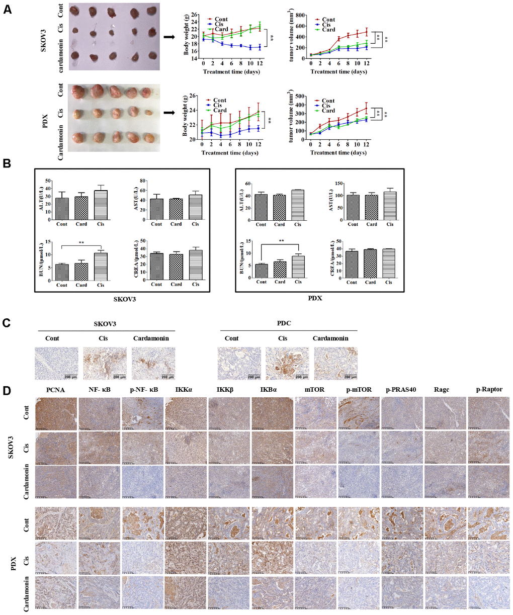 We examined apoptosis patterns in tumor sections of the xenograft tumors via the TUNEL assay. Our results showed that cardamonin could enhance apoptosis for both SKOV3 and PDC xenograft tumors (Figure 8C). IHC results further validated the modulation of NF-CB signaling and mTOR-related proteins in the xenograft tumors with cardamonin treatment.