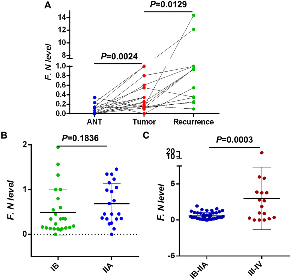 We collected primary cancer tissues and matched non-tumorous tissues and recurrent tumor specimen from these in individual 23 relapsed patients. Firstly, we evaluated the levels of F. nucleatum in cervical cancer tissues by using quantitative polymerase chain reaction (qPCR) assays, and concurrently analyzed these in individual patient matched non-tumorous tissues. Results from the assessment of all 23 patients indicated that burdens of F. nucleatum quantified by the orthonormal -ΔΔCt were significantly higher (P = 0.0024, Figure 1A) in tumor tissues compared with the adjacent non-tumor tissues. The results from paired tissue assessments for individual patients likewise revealed higher F. nucleatum levels in 17/23 pairs. We analyzed the abundance of F. nucleatum in relapsed patients above 23 all patients, and observed a marked enrichment in recurrent lesion than primary cervical cancer tissues (P = 0.0129, Figure 1B). The abundance of F. nucleatum based upon all tumor stages was analyzed. We found no difference in F. nucleatum levels in locally advanced cervical cancer tissues (IB, n = 25/IIA, n = 21; P = 0.1836, Figure 1C). However, an obvious enrichment of this bacterium was revealed in advanced stage tissues (III/IV, n = 20; P = 0.003, Figure 1D).