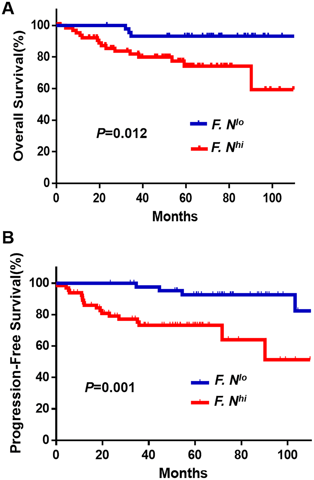 We next assessed F. nucleatum infiltration abundances for the 112 patients with cervical cancer and summarized their clinicopathological characteristics in Table 1. Kaplan-Meier analyses indicated that the relationships between F. nucleatum burdens and survival rates was dependent upon F. nucleatum infiltration such that patients with high levels exhibited poorer OS (P = 0.012, Figure 2A) compared with results for the low-burden group. Similarly, this finding was subsequently confirmed in progression-free survival analyses (P = 0.001, Figure 2B). These determinations allowed us to answer the question of whether or not the presence of F. nucleatum influenced patient survival rates.