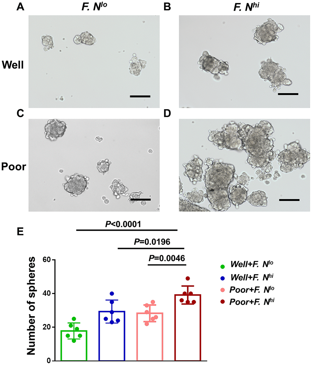 Given our data suggested that the level of intra-tumor F. nucleatum are correlated with the differentiation of cervical cancer cells, we further aimed to explore whether cancer cells obtained from patients with high intratumoral F. nucleatum levels were more stem-like. Primary cervical cancer cells were cultivated from patients with high or low intratumoral F. nucleatum levels, and poor or well differentiation (n = 6 respectively; Figure 4A–4D). Sphere formation assay was used to survey their self-renewal capacity. It indicated that more significantly larger spheres were formed by cells from high intratumoral F. nucleatum levels, especially in patients with poor differentiation at the same time (P<0.0001, Figure 4E).
