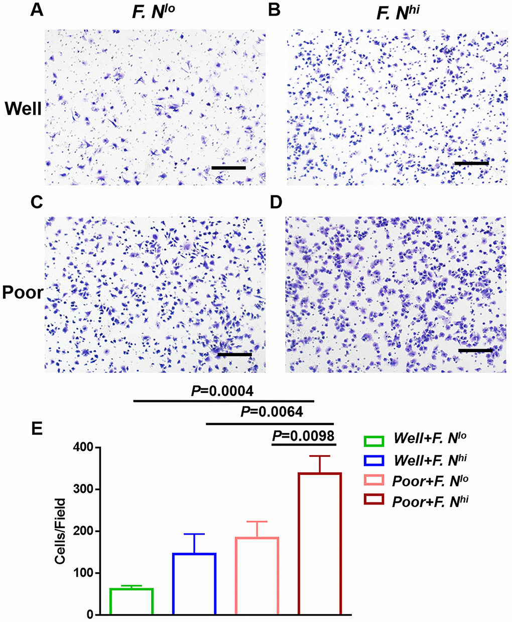 CSCs have a tendency to metastasize and our data suggested that F. nucleatum was a prognostic indicator of recurrence and metastasis in patients with cervical cancer, then the metastatic capacity of tumor cells was further examined using Matrigel invasion assays, wherein F. nucleatum levels were shown to increase the invasive capacity of primary cervical cancer cells (Figure 5D vs. 5C), even in patients with well differentiation (Figure 5B vs. 5A). In total, both sphere-formation and invasive abilities were significantly increased when F. nucleatum levels stood high (Figures 4E, 5E).
