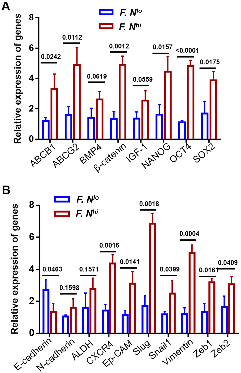 Finally, to confirm that high level of intratumrol F. nucleatum was functionally active, the expression levels of known genes related to tumor stemness (Figure 6A) and invasion (Figure 6B) were detected by RT-qPCR between patients with high and low F. nucleatum levels. We observed that expression levels of most genes were significantly increased in primary cervical cancer cells obtained from patients with high intratumoral F. nucleatum levels.