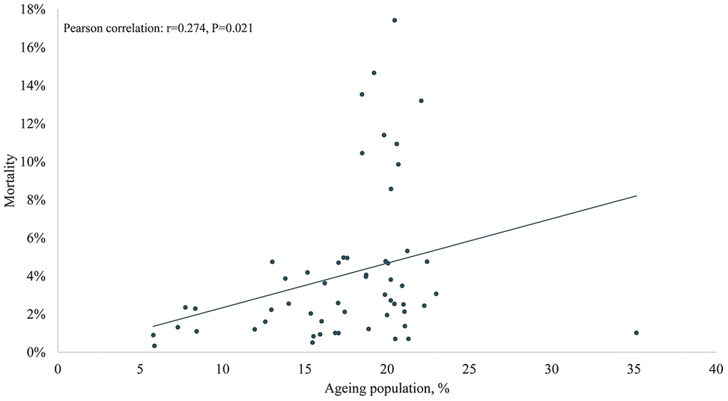 This study showed positive associations between COVID-19 mortality and ageing population, median age, and life expectancy at birth. Our findings can serve as a reference for old adults, medical staff, long-term care facilities and healthcare decision makers.
