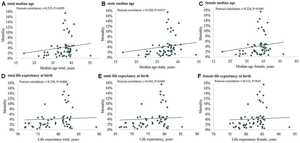 The results of Pearson correlation analysis between ageing population, median age, life expectancy and COVID-19 mortality were shown in Figures 1 and 2. The results showed significant positive associations between COVID-19 mortality and ageing population (Pearson correlation: r =0.274, P=0.021), median age (Pearson correlation: r =0.255, P=0.029), male median age (Pearson correlation: r =0.284, P=0.017), female median age (Pearson correlation: r =0.224, P=0.049), life expectancy at birth (Pearson correlation: r =0.336, P=0.006), male life expectancy at birth (Pearson correlation: r =0.342, P=0.005), female life expectancy at birth (Pearson correlation: r =0.312, P=0.01).