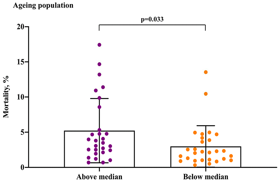 We estimated the association between ageing population, median age (total, male and female), life expectancy at birth (total, male and female) in 2020 and COVID-19 mortality in 56 European countries/areas. The results showed COVID-19 mortality was significantly associated with ageing population, median age (total, male and female) and life expectancy at birth (total, male and female).