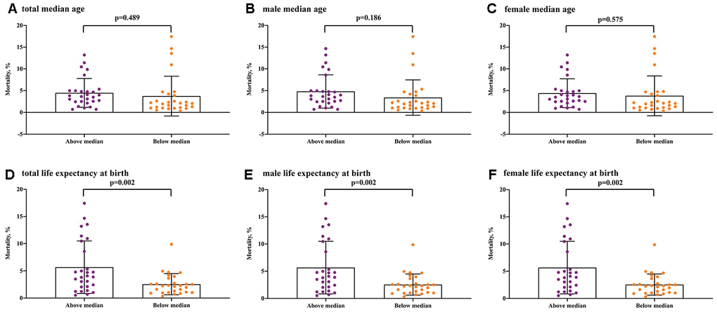 Regarding the ageing population in the 56 European countries/areas, COVID-19 mortality with 5.23% in the above median group was higher than 2.99% in the below median group (P= 0.033) (Figure 3). Regarding the median age, male median age and female median age, although the COVID-19 mortalities of the above median groups were slightly higher than the below median groups, there was no significant difference (median age, P=0.489; male median age, P= 0.186; female median age, P= 0.575) (Figure 4). Regarding the life expectancy, male life expectancy and female life expectancy at birth, the COVID-19 mortalities of the above median groups were significantly higher than the below median groups (P <0.01) (Figure 4).