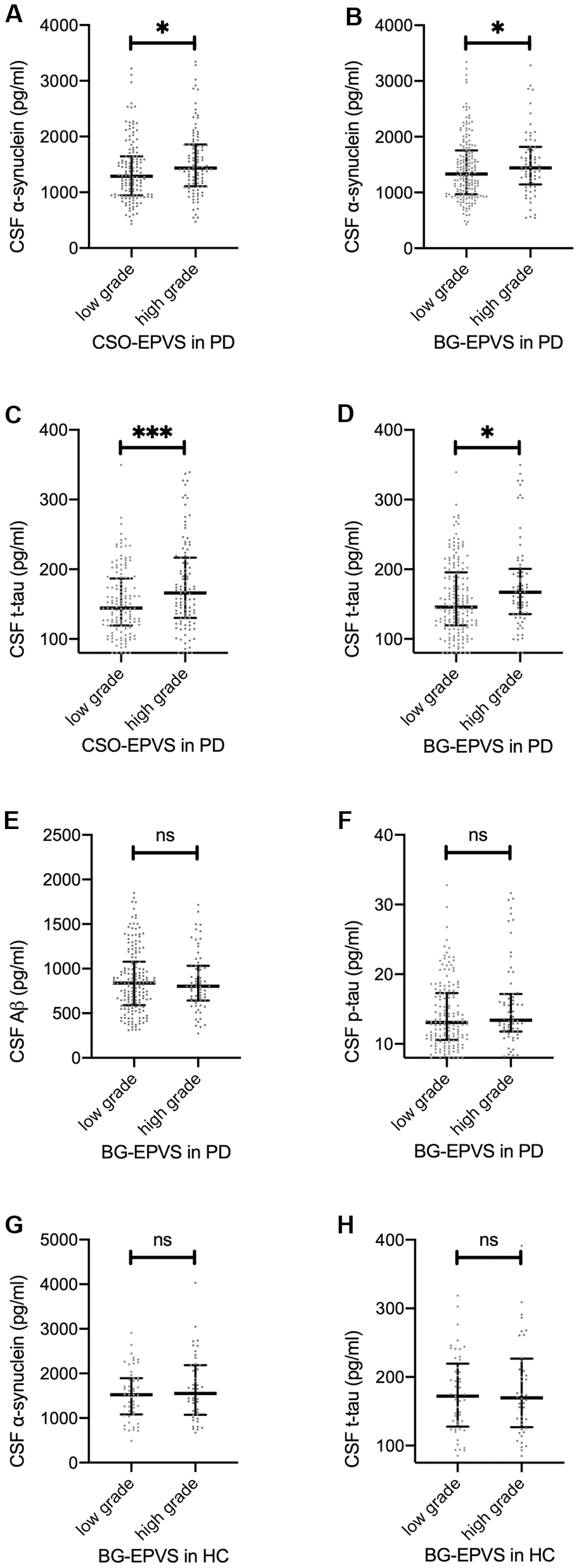 The association between EPVS and CSF protein at baseline is shown in Figure 1. For HCs, no significant associations between CSF protein values and EPVS scores were observed (Figure 1G, 1H).