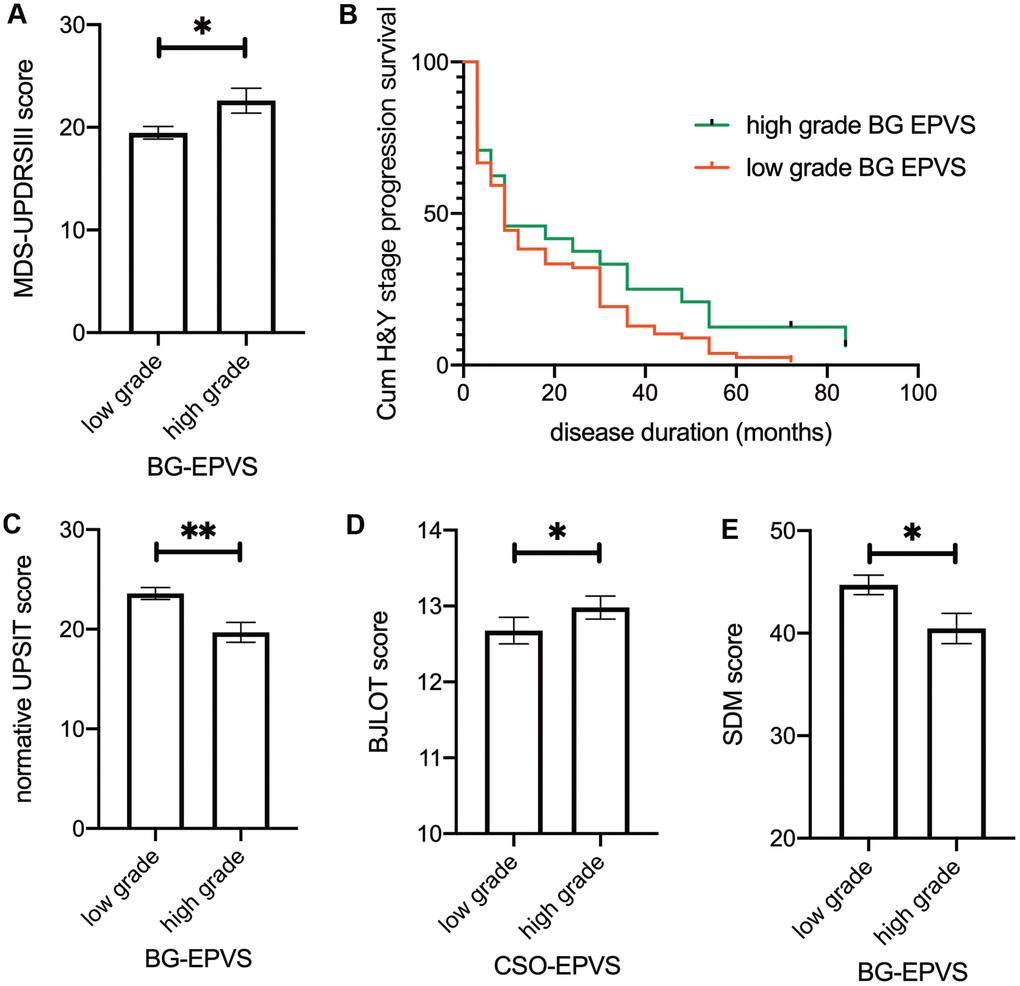 In brief, we found that higher BG-EPVS levels were associated with higher MDS-UPDRS III scores at baseline. Lower BG-EPVS levels were associated with faster H&Y stage progression.