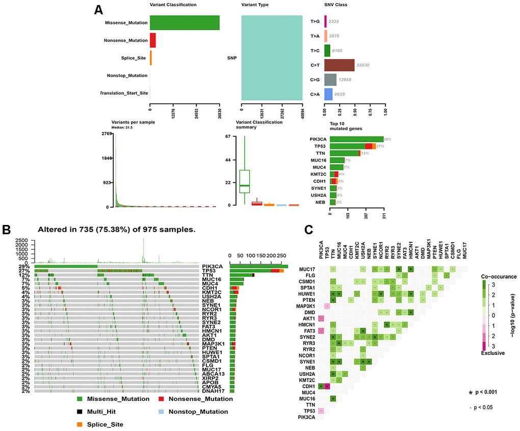 Analysis of the 1,044 BRCA mutation samples from TCGA is shown in Figure 1A. Missense mutation was the primary variant classification and all mutations belonged to single nucleotide polymorphisms. C>T was the most common variation in BRCA with the highest number of variations per sample and the median of variation types. In addition, the frequencies of mutations in PIK3CA (29%) and TP53 (27%) were the highest in mutant genes, all of which were missense mutations (Figure 1B). MUC17, HUWE1, SYNE1, TTN, MUC16, HMCN1 had equally higher co-mutation frequencies, while CDH1 and TP53 showed obvious mutuality of mutual exclusion (Figure 1C).