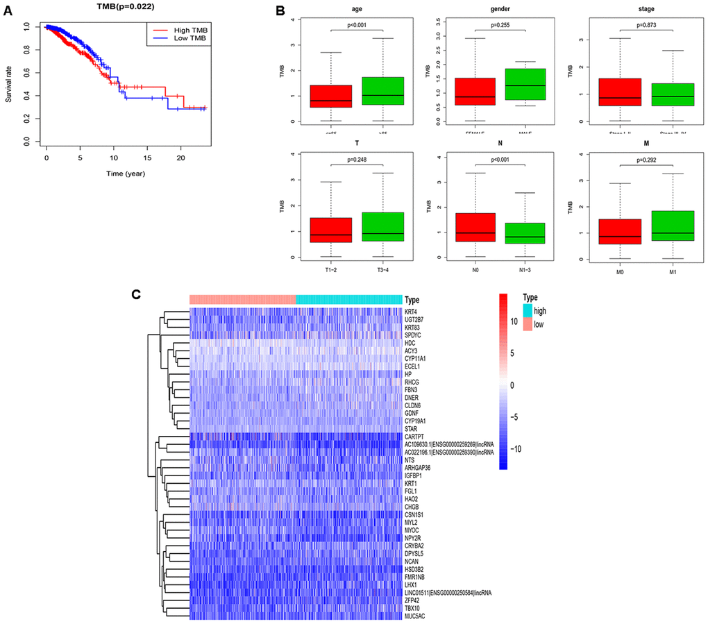 Normal samples in the tumor mutation data were deleted and the remaining tumor samples were cross-analyzed with the transcriptome samples. The median value of TMB was used as the threshold to divide samples into high and low TMB groups. The DEGs between the two groups were identified using the Wilcoxon rank test. The p value was adjusted by the false discovery rate (FDR) to improve the accuracy of the results, and the thresholds were set as FDR < 0.05 and logFC (fold change) > 1.0.