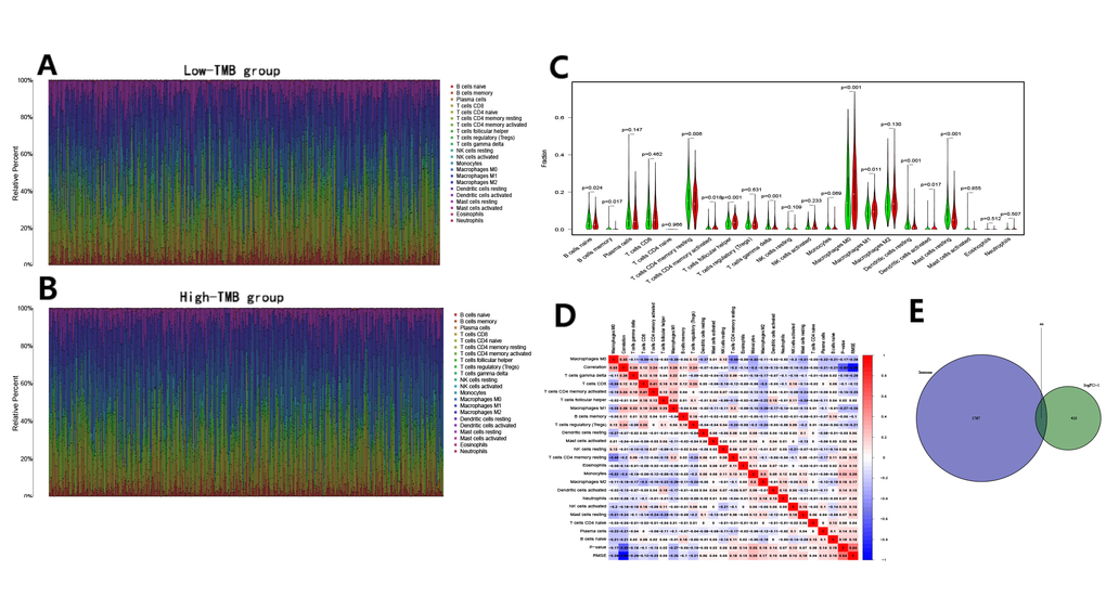 The deconvolution algorithm CIBERSORT [38] was used to evaluate the relative abundance of immune cells and the gene expression of tissue samples utilizing the gene expression characterization system of 22 different tumor-infiltrating lymphocyte subsets. The number of permutations was set to 1000, and a p-value <0.05 was regarded as successful. The immune cell matrix was obtained for each sample in the transcriptome data by the CIBERSORT R script v1.03. Similarly, the intrinsic differences in the abundance of immune cells between the high and low TMB groups were further explored and visualized by bar plots. The differences of immune cell infiltration between the high and low TMB groups were visualized by violin plots. Additionally, the list of immunologically relevant genes was downloaded from the ImmPort database (https://www.immport.org/) (Data Release 34, April 2020). Immune genes in DEGs were screened out using the Venn diagram. The univariate cox regression analysis was performed to identify prognosis-related immune genes (p<0.05).