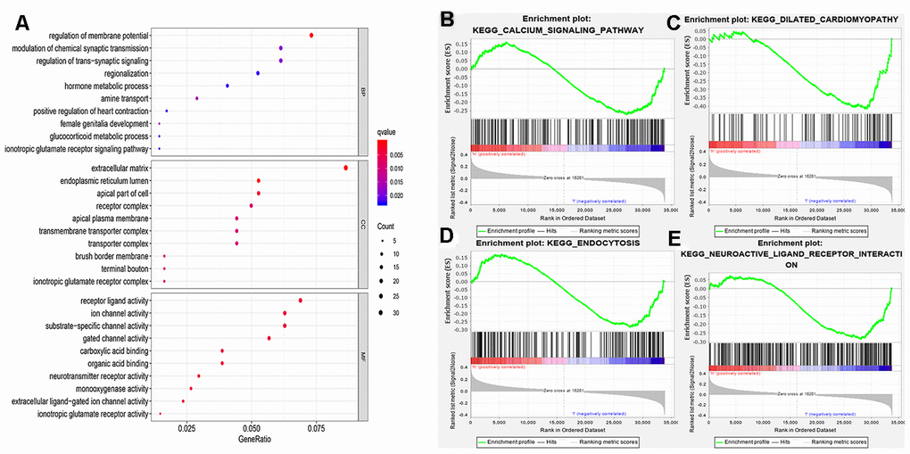 We further examined the functional enrichment of DEGs especially ADRB1. Based on gene ontology categories (Figure 4A), ADRB1 was significantly enriched in G-protein coupled receptor binding, neurotransmitter receptor activity, neurotransmitter receptor activity involved in the regulation of postsynaptic membrane potential, and postsynaptic neurotransmitter receptor activity in molecular function, regulation of membrane potential, positive regulation of heart contraction, and heat generation in biological process, synaptic membrane and postsynaptic membrane in cellular component. Gene Set Enrichment Analysis (GSEA) performed with TCGA data indicated that the calcium signaling pathway, dilated cardiomyopathy, endocytosis, and neuroactive ligand-receptor interactions were significantly enriched in samples with ADRB1 (Figure 4B–4E). The findings also showed that the four pathways ADRB1 located in were all significantly active in the low-TMB group.