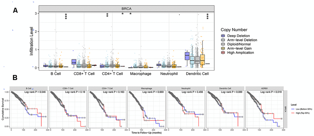 Generally, copy number variations (CNVs) refers to the increase or decrease in the copy number of a large segment in the genome whose length exceeds 1 kb. The results were presented in Figure 5A. In B cells and dendritic cells, high amplification of ADRB1 was significantly different compared to other CNVs (p<0.001). In addition, a high level of B cells suggested good prognosis of BRCA, and high expression of ADRB1 may prompt better survival (Figure 5B).
