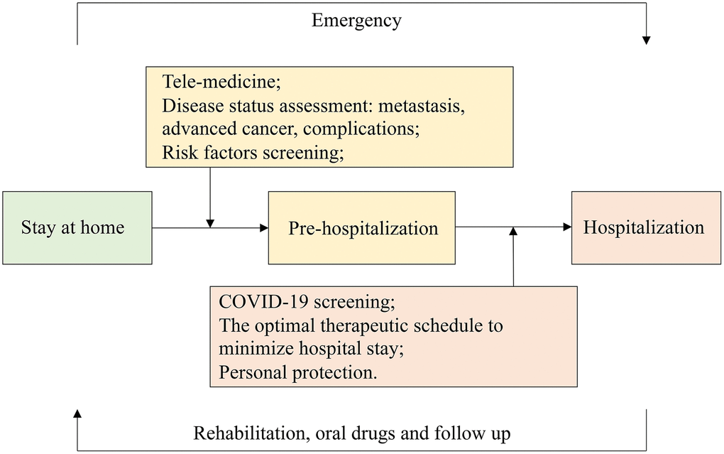 Three main management strategies may be necessary for cancer patients with COVID-19 (Figure 2). First, hospital infection should be avoided [14]. It was estimated that 3.5% of healthcare workers were infected [15], and high infectivity led to very serious and early nosocomial infections. Therefore, medical institutions need to reemphasize the importance of basic infection control measures. Some cancer patients were also proven to be infected with COVID-19 when receiving anti-cancer treatments during hospitalization, especially lung cancer patients. However, both the risk of cancer development and nosocomial infection should be considered, and postponing anti-cancer treatment is not recommended [18]. Therefore, strict screening and shunting procedures for admission [44], strong personal protection measures for medical staff and cancer patients [14], and appropriate isolation programs [32] should be developed. Cancer patients should stay in the observation ward for at least 7 days before their anti-cancer treatment, and they should be isolated from other patients. The personal protection of cancer patients, including their family members, should be strengthened to avoid cross-infection [18]. Active treatment measures should be taken to reduce the frequency of hospitalization of cancer patients during the COVID-19 epidemic [32]. Patients with cancer before admission and anyone accompanying them should be actively screened for COVID-19 using chest CT scans, nucleic acid analyses, and antibody detection methods.