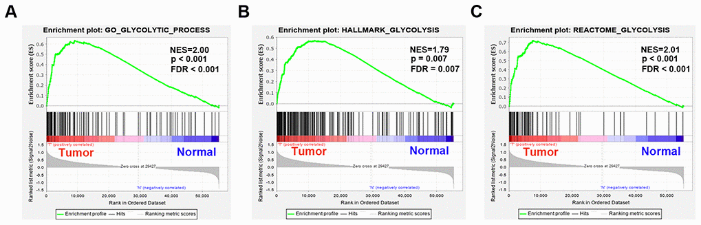 To explore whether glycolysis-related genes exhibit statistically significant, concordant differences between EAC and normal samples, five glycolysis-related gene sets, the Hallmark, BioCarta, KEGG, GO and reactome gene sets, were downloaded from the Molecular Signatures Database and analyzed with GSEA software 4.0.3. For selecting gene sets enriched in every phenotype, a normalized enrichment score (NES) was obtained by performing 1000 gene set permutations for each analysis. Finally, subsequent analysis was performed when the false discovery rate (FDR) < 0.1, normalized P < 0.05 and |NES| > 1.6 of the gene set.