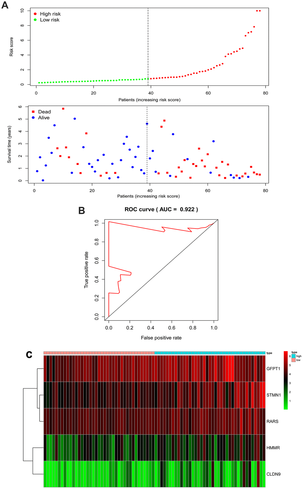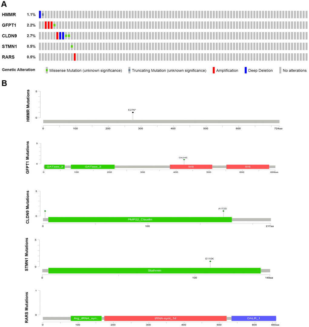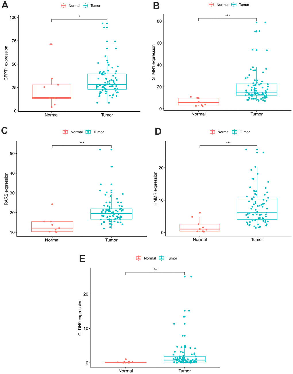 An unpaired t test was used to assess the differential expression of 5 genes in 78 EAC tissues and 9 normal tissues. In comparison with normal tissues, results showed that CLDN9, GFPT1, HMMR, RARS and STMN1were upregulated in EAC tissues (Figure 3).