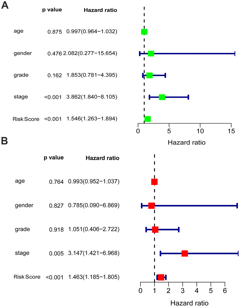 Univariate and multivariate analyses were utilized to analyze the effect of each clinicopathological feature in comparison with the five-gene signature on survival. The prognostic value of the glycolysis-related risk score for OS in EAC patients was tested in combination with clinical features including age, gender, grade and stage. The results of univariate analysis indicated that stage [HR = 3.862, 95% confidence interval (CI): 1.840 - 8.105, P < 0.001] and risk score [HR = 1.546, 95% CI: 1.263 - 1.894, P < 0.001] were correlated with the prognostic outcome (Figure 6A). Subsequently, multivariate Cox analysis suggested that stage [HR = 3.147, 95% CI: 1.421 - 6.968, P = 0.005] and risk score [HR = 1.463, 95% CI: 1.185 - 1.805, P < 0.001] were independent prognostic indices (Figure 6B).