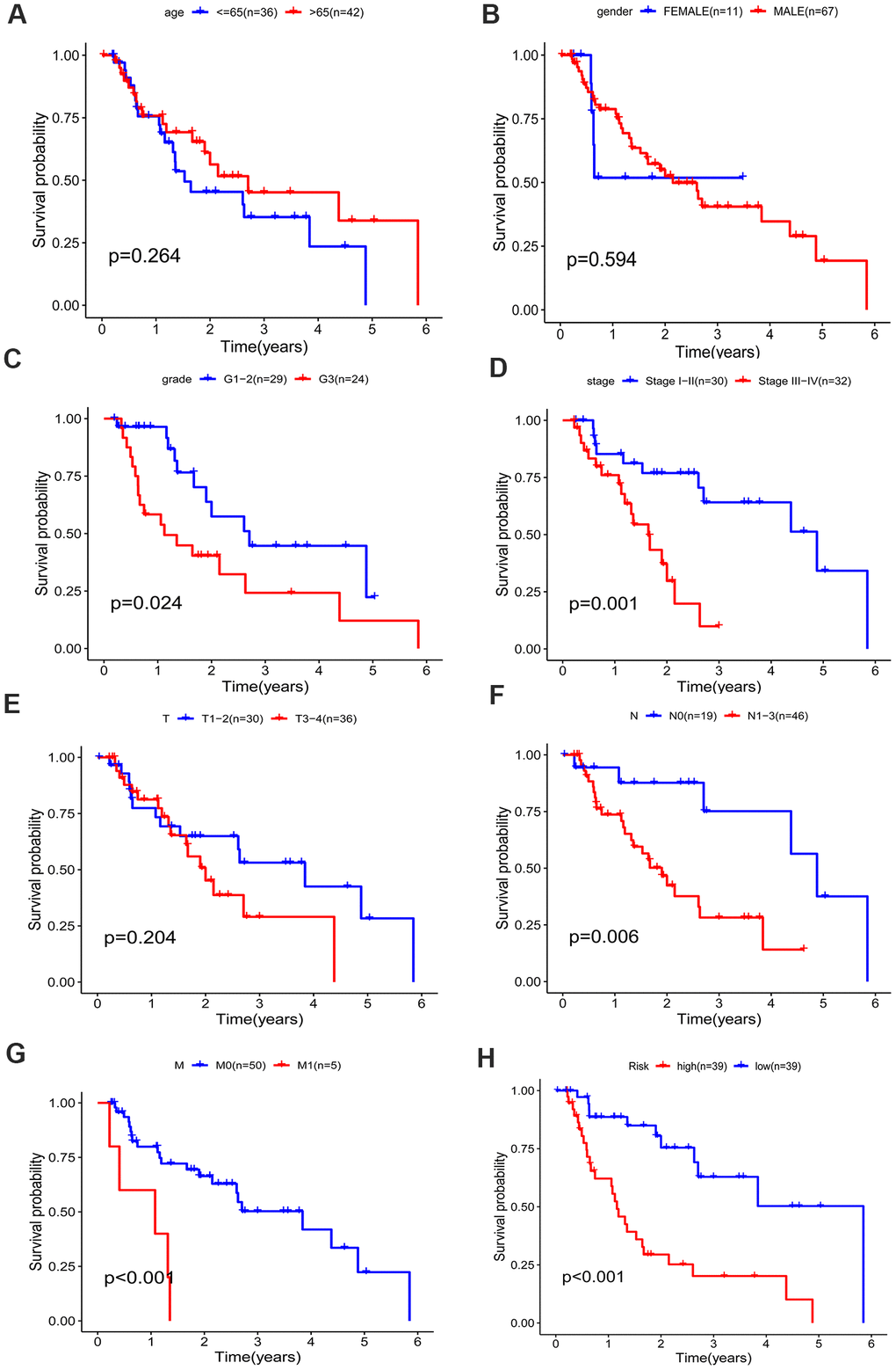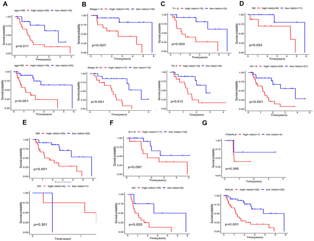 A better prognosis in the low-risk score group was revealed by the log-rank method and Kaplan-Meier survival curves (P < 0.001) (Figure 7H). The UICC (Union for International Cancer Control) stage and five-gene signature were significant in predicting the survival rate of EAC patients in the univariate Cox regression analysis, and the above results were confirmed by the K-M method. Patients at grade 3, III-IV stages (UICC stage) and with lymph node and distant metastasis demonstrated a poor prognosis (Figure 7A–7G), in accordance with the survival curves. Stratified analysis was carried out as the above results further confirmed the accuracy of our analysis. As shown in the K-M curves, the five-gene signature was a dependable prognostic indicator for EAC patients who were in the low-risk group and had a better prognosis (Figure 8A–8C). However, in the N0 (Figure 8D), M1 (Figure 8E), G1-2 (Figure 8F) and female (Figure 8G) subgroups, the risk parameter could no longer independently act as a prognostic marker.
