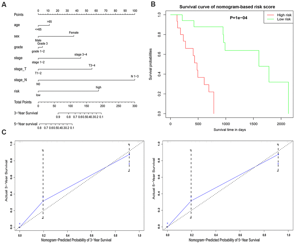 The survival probability of EAC patients was compared by the nomogram model, which integrated with thefive-gene signature with clinicopathologic features; this was performed by R software (version 4.0.2). Calibration plots and C-index were generated as an assessment of the nomogram performance. The clinical outcome prediction is displayed on the y-axis and x-axis separately in the calibration graph, with which an ideal prediction could be indicated with a 45-degree dotted line. Bootstrapping was used as an internal validation to decrease the bias of the C-index’s predictive ability.