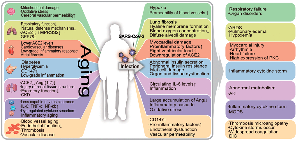 Biological aging in humans is characterized by genomic instability, telomere attrition, epigenetic alterations, loss of proteostasis, dysregulated nutrient sensing, mitochondrial dysfunction, cellular senescence, stem cell exhaustion, and altered intercellular communication. These abnormal changes in the body lead to age-related damage [1, 2]. The accumulation of aging-related damage leads to increased morbidity and mortality among the elderly [3]. Aging lowers the human body’s resistance to pathogens and impairs the subsequent immune responses. In the case of severe acute respiratory syndrome coronavirus 2 (SARS-CoV-2) pneumonia, the damages caused by human aging are closely related to the deterioration of the condition of the patients. Aging adults are more likely to have underlying comorbidities and are therefore at greater risk of deterioration of coronavirus disease-2019 (COVID-19) [4]. In Figure 1, we have summarized the association between COVID-19 and aging in various organs.