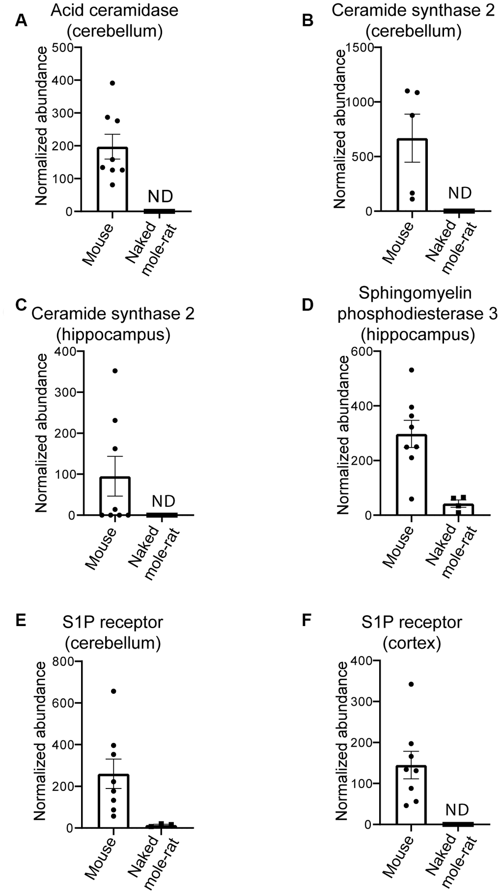 Experiments were performed on lipids and proteins extracted from C57BL6/J mice and non-breeding naked mole-rats. A mixture of males and females were used of both species, all adults for lipid studies. For proteomic studies, mice (N=8) were euthanized at 2-weeks (N=4) and 6 months (N=4) of age. Similarly, NMRs were euthanized at 2-4 months (N=4) and 3 years (N=4) of age. Cerebellum, cortex and hippocampus were collected and flash frozen, as previously described [33]. Mice were conventionally housed with nesting material and a red plastic shelter in temperature-controlled rooms at 21° C, with a 12 h light/dark cycle and access to food and water ad libitum. Naked mole-rats were bred in-house and maintained in an inter-connected network of cages in a humidified (~55 %) temperature-controlled room at 28° C, with red lighting (08:00-16:00) and had access to food ad libitum. In addition, a heat cable provided extra warmth under 2-3 cages/colony. Mice were humanely killed by cervical dislocation of the neck and cessation of circulation, whereas naked mole-rats were killed by CO2 exposure followed by decapitation. Experiments were conducted under the Animals (Scientific Procedures) Act 1986 Amendment Regulations 2012 under a Project License (P7EBFC1B1) granted to E. St. J. Smith by the Home Office and approved by the University of Cambridge Animal Welfare Ethical Review Body. Experiments performed for proteomic analysis were done so in accordance with institutionally-approved protocols at the University of Illinois at Chicago (PI – T.J. Park).