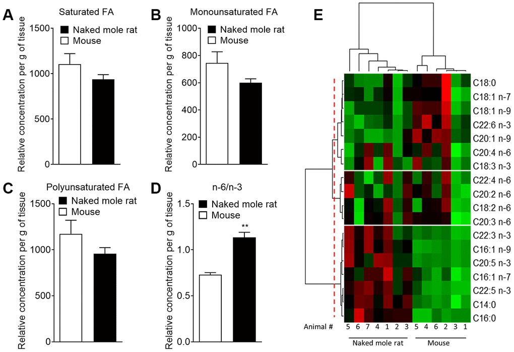 With the finding that multiple lipids were present at different levels in the two species, we sought to investigate if these differences extended at the protein level. Using an untargeted differential proteomic study, we compared protein abundance between mice and naked mole-rats (Figure 2). We observed decreased levels of acid ceramidase, the enzyme responsible for ceramide degradation into sphingosine – a primary constituent of sphingolipids – and free fatty acids, in naked mole-rat cerebellar tissue (Figure 2A). Ceramide synthase 2, which catalyses the formation of ceramide with selectivity towards very long, C22:0 – C24:0 chains, was also decreased in naked mole-rats in both hippocampal and cerebellar tissue lysates (Figure 2B, 2C). Sphingomyelinase (sphingomyelin phosphodiesterase 3 / neutral sphingomyelinase 2), which catalyses the hydrolysis of sphingomyelin to ceramide and phosphocholine, was also decreased in naked mole-rat hippocampal tissue (Figure 2D) as was sphingosine-1-phosphate receptor 1 in the cerebellum and cerebral cortex (Figure 2E, 2F). The normalized protein abundances are provided for each brain region in the supplemental information (Supplementary Figure 1). Due to the complexities of sphingomyelin biosynthesis and degradation, the proteomic changes observed could align with the lower sphingomyelin levels observed. For example, lower acid ceramidase abundance results in less sphingosine generation by ceramide cleavage, and one pathway for sphingomyelin production involves sphingosine conversion to sphingosyl-phosphocholine and then into sphingomyelin. Overall, naked mole-rat brain lipids contained a higher concentration of cholesterol and lower concentration of sphingomyelins, which were of shorter length than those present in mouse brains, but contained a higher percentage of saturated sphingomyelin (Supplementary Figure 2). We completed the comparison of lipid composition of naked mole-rat and mouse brains by quantifying the concentration in total fatty acids (FA). No significant differences were observed between the concentrations of saturated (SFA), monounsaturated (MUFA) and polyunsaturated fatty acids (PUFA) in mouse and naked mole-rat brains (Figure 3A–3C). However, the n-6/n-3 ratio of PUFAs was increased in naked mole-rat brains compared to mouse brains (Figure 3D). The relative abundances of these FA were evaluated and presented as a heatmap (Figure 3E) and as a table (Supplementary Table 7). We found that the FA profile was different between mouse and naked mole-rat brains, as illustrated by a clustering of mouse and naked mole-rat depending on the number of carbon atoms within the FA (Figure 3E). Three major groups of FA were identified: cluster 1 contained lipids which were more abundant in mouse brains, cluster 2 contained FA which were not differentially expressed between mouse and naked mole-rat brains, and cluster 3 contained lipids that were more abundant in naked mole-rat brains (Figure 3E). As observed for the ceramides and sphingomyelin, the SFA and MUFA abundant in naked mole-rat brains (cluster 3) were of shorter length than those present in mouse brains. Supplementary Tables 1–7 provide a detailed comparative overview of the percentage of different lipid species identified in mouse and naked mole-rat brain lipids.