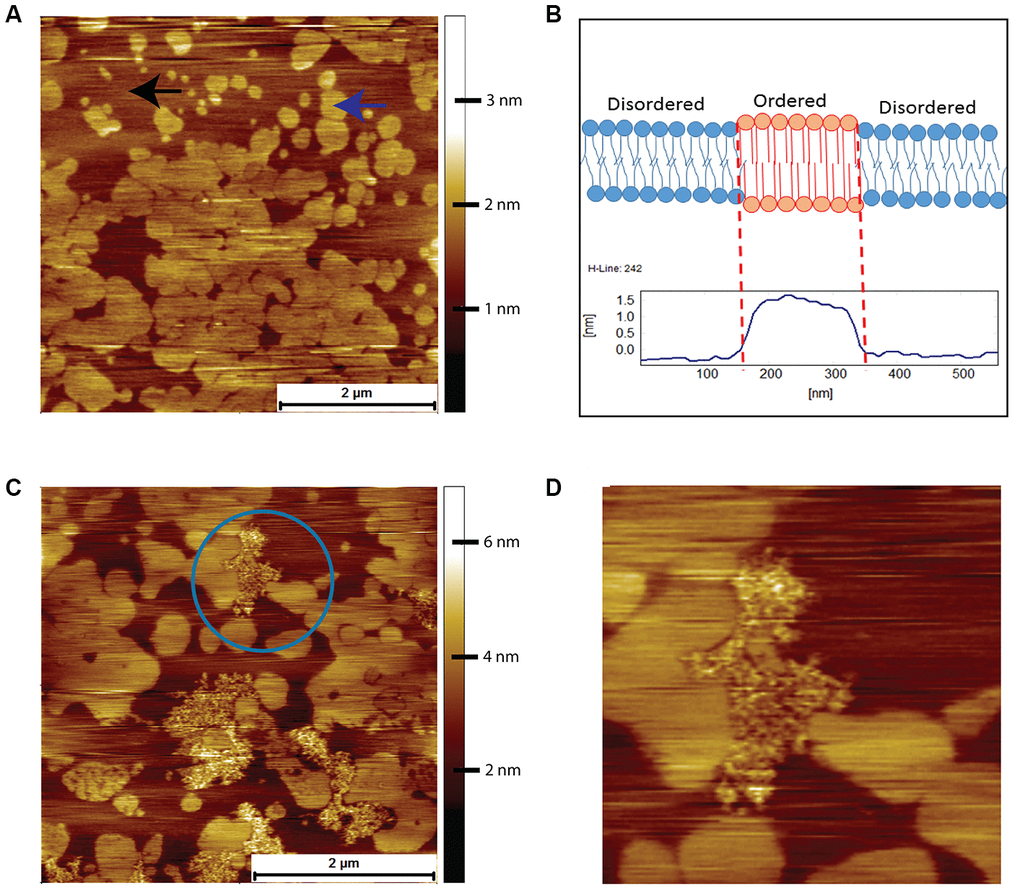 Prior to an AFM examination of the interactions between human Aβ and the brain tissue derived lipids, we used a simple model system comprising of just two lipids, DOPC and DPPC. This system exhibits phase separation and provides a well-defined comparison for the more complex mixture of lipids present in brain derived lipids. When the binary system was mixed in a molar ratio of 3:1 of DOPC-to-DPPC, we observed the classic phase-separated DPPC gel domains surrounded by the liquid disordered DOPC (Figure 4A). The origin of the islands of DPPC is due to the packing arrangement of DPPC chains, resulting in a height difference of around 1.5 nm to the surrounding DOPC (Figure 4B). Such spontaneous phase separation behaviour in model systems has been used as a rationale for the existence of lipid rafts in cells [25]. After a 2-hour exposure to 8 μM of human Aβ the bilayer remained completely intact, but with clearly visible features due to the Aβ peptide in between the DPPC gel phase domains, which are absorbed on top of the DOPC liquid disordered phase (highlighted by blue circle in Figure 4C). Upon closer inspection, the Aβ was observed to avoid the gel phase domains, such that the central DPPC gel domain was surrounded, but not covered, by the peptide (Figure 4D).