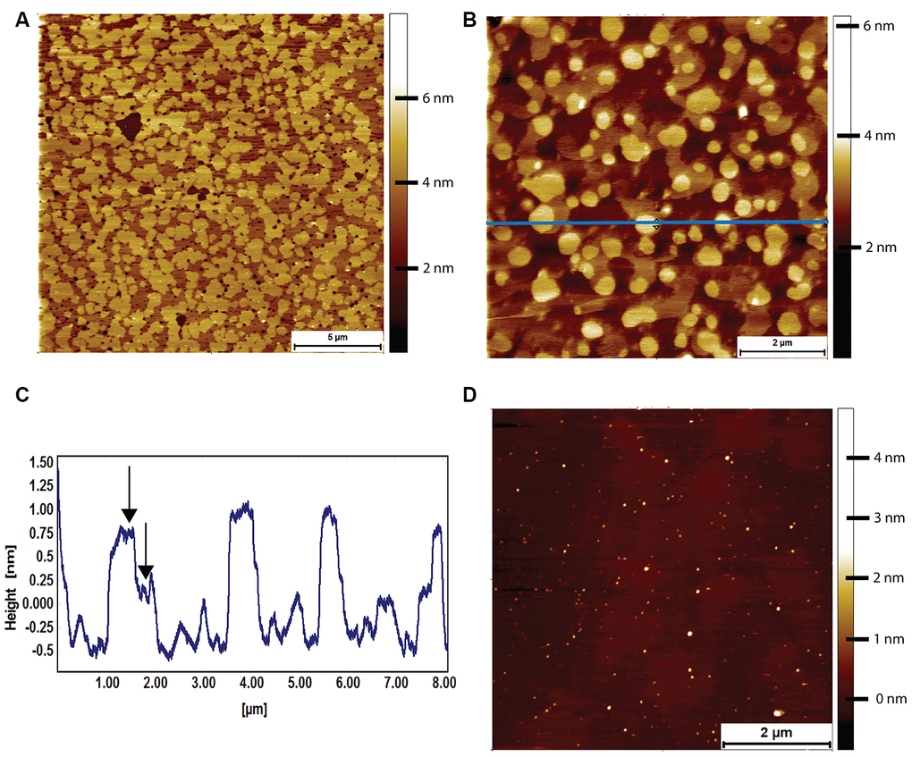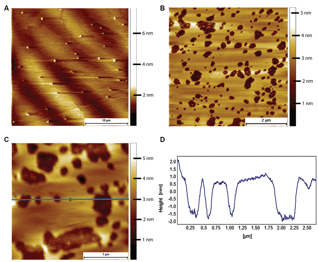 2-Dipalmitoyl-sn-glycero-3-phosphocholine (DOPC) and 1, 2-dioleoyl-sn-glycero-3-phosphocholine (DPPC) (Avanti Polar Lipids) were dissolved in chloroform in a 3 to 1 molar ratio and dried under nitrogen. These lipids mixtures were then re-suspended in ultrapure water to a final concentration of 1 mg/ml and intensively vortexed at room temperature. For brain derived lipids the lipids were dried down to form a film and then resuspended in ultrapure water. Uni-lamellar vesicles were formed via ten cycles of freeze-thawing followed by extrusion ten times) through a polycarbonate membrane with pores sizes of 100 nm using a mini-extruder (Avanti Polar Lipids) kept 50° C on a hotplate. 200 μl of solution containing the extruded vesicles was pipetted onto freshly cleaved muscovite mica and this was then placed on a thin metal disk that itself was placed on a hotplate. The hotplate was heated up to 50° C and the sample was annealed for 15 minutes. The sample was then loaded into the AFM liquid cell ready for imaging.
