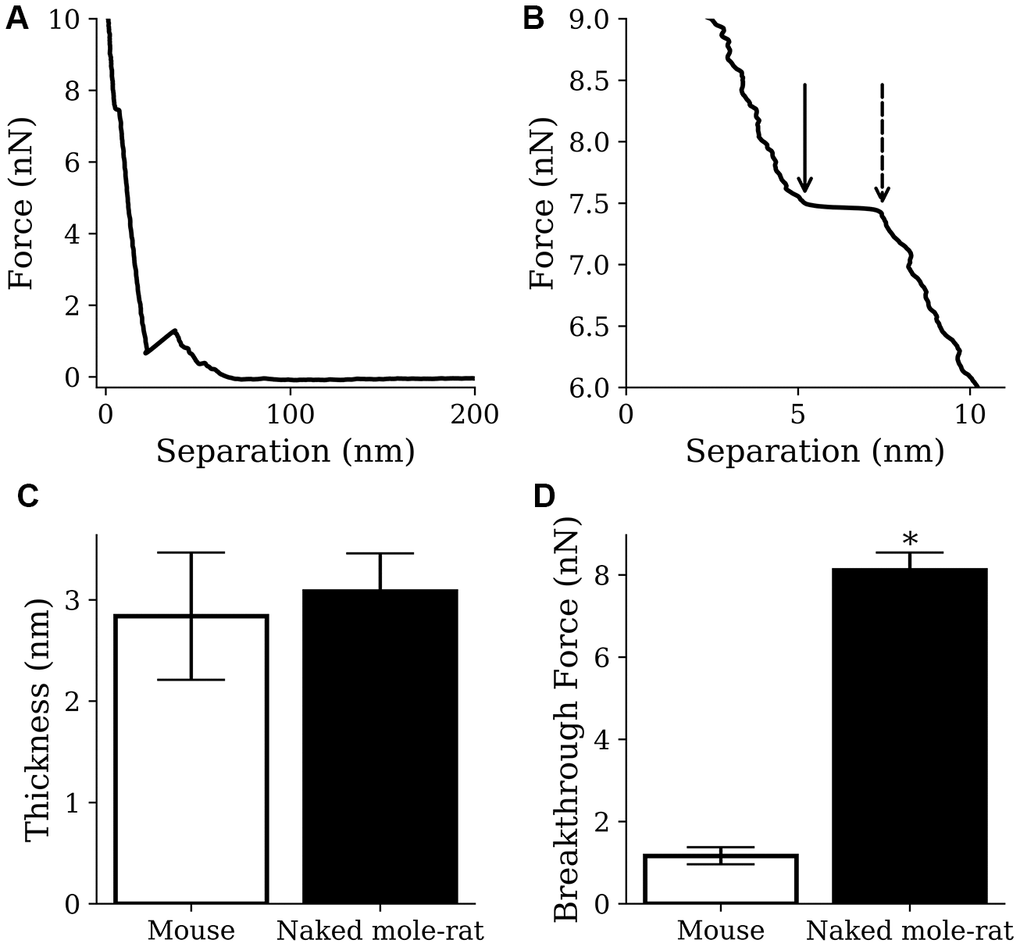 By indenting the conical AFM tip into the lipid bilayer it is possible to measure the breakthrough force [26], which is the force required to push through the soft thin film (Figure 6A, 6B), thereby providing an indication of the membrane fluidity. It also allows the measurement of membrane thickness, which is a necessary confirmation that a thin soft bilayer is being imaged. Although no difference was observed in the thickness of lipid bilayer membranes formed from mouse or naked mole-rat brain derived lipids (Figure 6C), the breakthrough force measurements for naked mole-rat membranes were significantly higher than mouse (Figure 6D), meaning that naked mole-rat lipid bilayer membranes are stiffer. The enhanced stiffness of naked mole-rat lipid bilayer membranes is most likely due to the increased cholesterol, which is known to increase membrane rigidity [27].