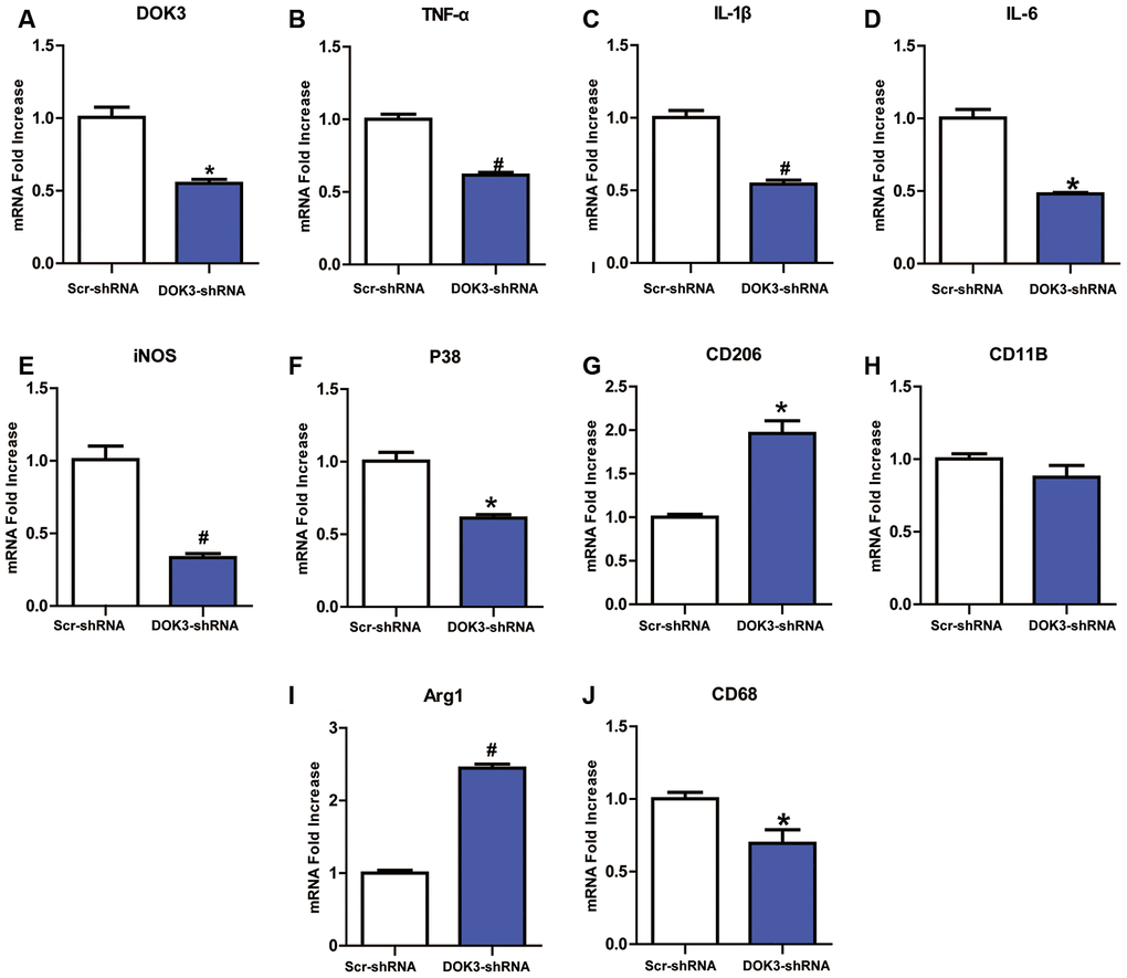 DOK3 appears to be involved in immune defense by macrophages and B cells [15, 19], but its role in microglia remains underappreciated. To first determine a role for DOK3 in microglia, we infected microglia with a lentivirus containing a DOK3-specific short hairpin RNA (shRNA) to elucidate whether down-regulated DOK3 expression altered microglial inflammatory responses. As shown in Figure 1A, DOK3 mRNA levels decreased by almost 50% in DOK3-shRNA cells compared with vehicle-treated microglia (Scr-shRNA), and protein levels were confirmed by western blotting analysis (Supplementary Figure 1D). Several inflammatory mediators associated with nociceptive or inflammatory signaling showed a greater down-regulation in DOK3-shRNA than in Scr-shRNA microglia, including TNF-α (Scr-shRNA 1.0±0.06 vs. DOK3-shRNA 0.62±0.03, p < 0.01), IL-1β (Scr-shRNA 1.0±0.08 vs. DOK3-shRNA 0.54±0.05, p < 0.01), IL-6 (Scr-shRNA 1.0±0.06 vs. DOK3-shRNA 0.88±0.14, p < 0.05), P38 (Scr-shRNA 1.0±0.11 vs. DOK3-shRNA 0.61±0.04, p < 0.05), iNOS (Scr-shRNA 1.0±0.16 vs. DOK3-shRNA 0.33±0.05, p < 0.01), and CD68 (Scr-shRNA 1.0±0.07 vs. DOK3-shRNA 0.69±0.16, p < 0.05, Figure 1B–1G). These molecules are also important inflammatory mediators during microglial activation. Conversely, Arg1 and CD206 (as typical M2 markers employed by M2 microglia to antagonize inflammatory responses [26, 27]) were induced to a greater degree in the DOK3-shRNA microglia (Scr-shRNA 1.0±0.06 vs. DOK3-shRNA 2.45±0.09, p < 0.01; Scr-shRNA 1.0±0.06 vs. DOK3-shRNA 1.96±0.26, p < 0.05, Figure 1I, 1J). The levels of CD11B mRNA were only slightly changed, with no significant difference between the 2 groups. These findings suggested that DOK3 regulated the release of a subset of inflammatory mediators in microglia under physiologic conditions, and that it is therefore plausible that the DOK3-shRNA phenotype was responsible for the reduced capacity of microglia to launch an inflammatory response.