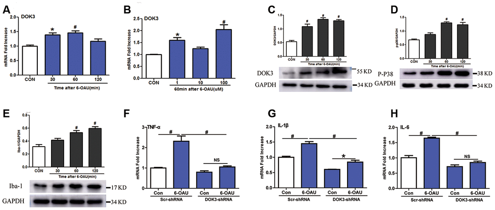 Knowing that GPR84 activation promoted a proinflammatory microglial phenotype [24], we next determined whether an activated GPR84-increased inflammatory response in microglia was due to a direct effect of DOK3. We incubated microglia with 6-n- octylaminouracil (6-OAU, a surrogate agonist for GPR84) for different durations (30, 60, and 120 min) and at different concentrations (1, 10, or 100 μM). As depicted in Figure 2A–2C, 6-OAU in a time-dependent fashion increased DOK3 mRNA and protein at a concentration of 1 μM and increased DOK3 in a concentration-dependent fashion after 60 min of exposure. Since p-p38 and ionized calcium-binding adapter molecule-1 (Iba-1) are key kinases in nociceptive pathways and correlate with microglial activation [23, 24], we also assessed whether GPR84 activation modulated p-p38 and Iba-1 levels. As we expected, there was an equivalent increase in both p-p38 and Iba-1 protein expression as DOK3 protein was upregulated after 6-OAU treatment (Figures 2D, 1E), and this was commensurate with increased levels of IL-1β, TNF-α, and IL-6 (Supplementary Figure 1A–1C). Collectively, these data suggested that the increased p-p38 and Iba-1 protein levels—accompanied by increased TNF-α, IL-6, and IL-1β mRNA levels—were associated with increased DOK3 in microglia.