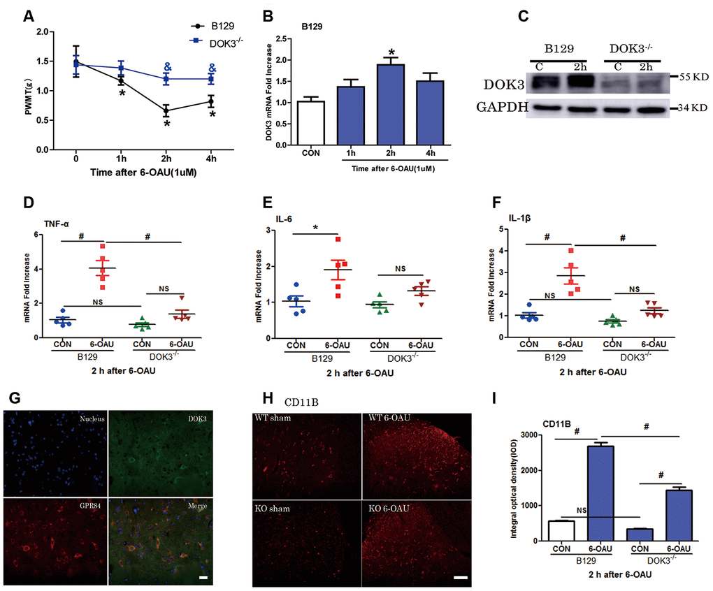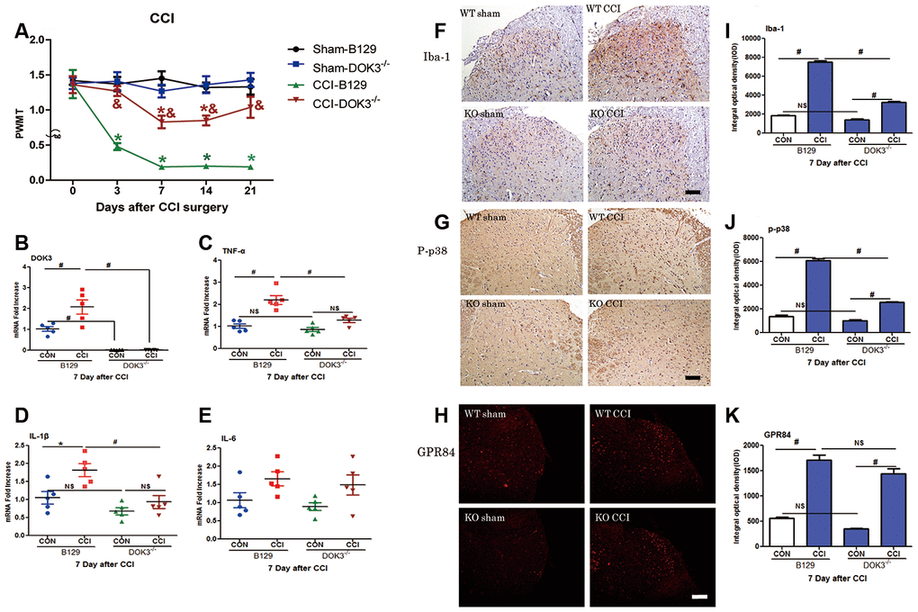 These in vivo results demonstrated that DOK3-/- mice had a weakened state of CCI-induced inflammatory cytokine activity, which was significantly lower than in WT mice after CCI induction. Therefore, we posit that DOK3 plays a positive role in modulating inflammatory actions and microglial activation in response to peripheral neuropathy.