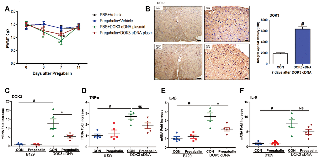 The ultimate goal of our research was to relieve pathologic pain and increase clinical relevance. Since DOK3 was critical to neuropathic pain in mice, we reasoned that supplementation of pregabalin might prevent the development of inflammatory states by inhibiting DOK3. Accordingly, we generated a plasmid harboring DOK3 cDNA or vector plasmid and introduced it into mice via intrathecal injection daily for 3 days. We then simultaneously administered a daily 14-day intragastric injection of pregabalin (Lyrica, Pfizer Manufacturing Deutschland GmbH).