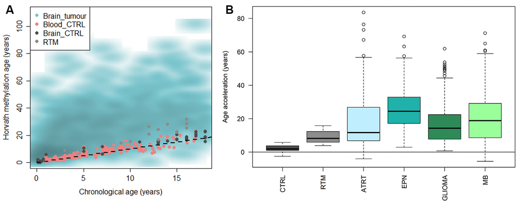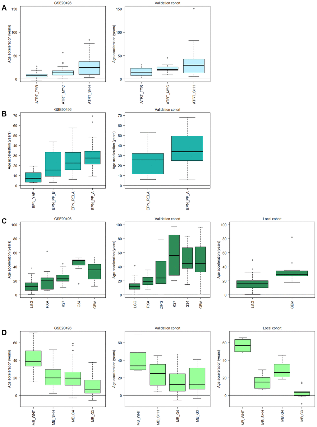 Previous publications on methylation age in brain tumors have shown a median age acceleration of 35 years in a combined dataset of adult and pediatric GBM [10, 11], and accelerated aging was observed in 14 of 15 adult GBM (mean 25 years acceleration) and in all three evaluated meningioma tumors (mean 13 years acceleration) [50], which is in line with our findings in pediatric samples (median age acceleration 29 years in GBM local cohort). Also, a publication on adult glioma [51] showed that methylation age estimated with both Horvath and epiTOC differs between the subtypes of (adult) glioma, in line with our observations in pediatric samples of glioma and also in ATRT, ependymoma and medulloblastoma. As with gliomas, sub-types with the worst prognosis displayed the highest age acceleration in ATRT and ependymoma in our study. In medulloblastoma, however, we observed a reverse relationship between age acceleration and subtype, i.e. the WNT subtype with the best prognosis had the highest age acceleration. The correspondence between acceleration and prognosis suggests that methylation age might be of prognostic significance for ependymoma, ATRT, medulloblastoma, and glioma. However, larger methylation datasets with information on time to relapse and survival outcomes are needed to validate this finding.