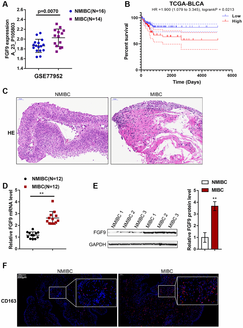 Next, we collected 12 MIBC and NMIBC tissues, and the H&E staining results are shown in Figure 1C. Then, the expression of FGF9 in the tissues of 12 cases of MIBC and 12 cases of NMIBC was monitored using real-time PCR. Consistent with online data, the expression of FGF9 was dramatically upregulated in MIBC tissue samples compared with NMIBC tissue samples (Figure 1D). Immunoblotting analysis showed that FGF9 protein contents were increased within MIBC tissue samples compared with NMIBC tissue samples (Figure 1E). The protein content and distribution of CD163 (M2 macrophage marker) were determined in MIBC and NMIBC tissues using immunofluorescence (IF) staining; notably, the results showed that CD163-positive cells were more frequently observed in MIBC samples (Figure 1F). These data suggest that FGF9 is overexpressed in bladder cancer, especially in MIBC. In addition, M2 macrophages account for a greater proportion of macrophages in MIBC. Thus, we speculate that FGF9 might promote bladder cancer development, possibly by promoting macrophage M2 polarization.