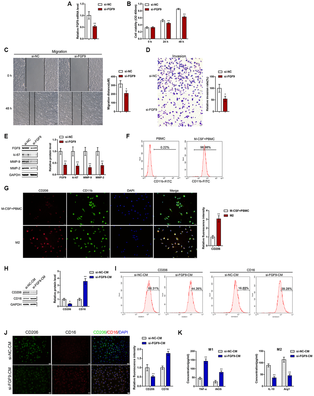 To validate the effects of FGF9 on macrophage M2 polarization in bladder cancer, we isolated monocytes from peripheral blood (PBMCs) and stimulated the monocytes with 50 ng/ml M-CSF for polarization induction. The macrophages were identified as CD11b positive by flow cytometry (Figure 2F). The polarized M2 macrophages were identified by IF for CD11b and CD206 expression. The results showed that the inflorescence intensity of CD206 expression was dramatically increased after M2 polarization (Figure 2G). Next, T24 cells were transfected with si-FGF9 or si-NC (negative control) and the culture medium (shown in the figures as conditioned medium si-NC-CM and si-FGF9-CM) was collected for macrophage incubation. M0 macrophages were divided into four groups: IL-4 (M2 polarization inducing) + si-NC-CM, IL-4 (M2 polarization inducing) + si-FGF9-CM, LPS + IFNγ (M1 polarization inducing) + si-NC-CM, and LPS + IFNγ (M1 polarization inducing) + si-FGF9-CM, and then the M1/M2 polarization markers were examined. Under M2 polarization conditions, culture with si-FGF9-CM significantly decreased the protein levels of M2 macrophage marker CD206 while increasing the M1 macrophage marker CD16 (Figure 2H). Moreover, the flow cytometry results and IF results further confirmed that si-FGF9-CM decreased the percentage of CD206 positive cells and CD206 fluorescence intensity while increasing the percentage of CD16 positive cells and CD16 fluorescence intensity (Figure 2I, 2J). ELISA also revealed that the concentrations of the M2 markers IL-10 and Arg1 were increased in si-FGF9-CM treated cells and that the concentrations of M1 markers iNOS and TNF-α were decreased in si-FGF9-CM treated cells (Figure 2K). These data indicate that FGF9 knockdown in bladder cancer cells could attenuate the macrophage M2 polarization in through the cancer microenvironment.