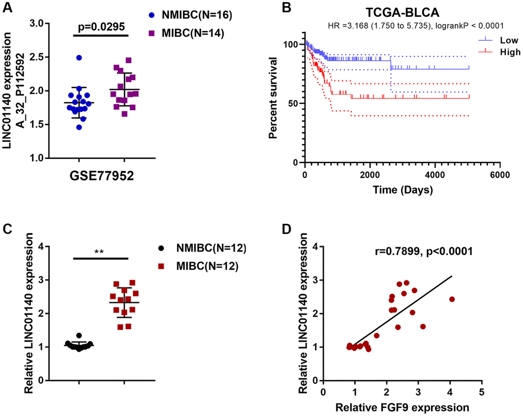 Next, LINC01140 expression was determined in tissues from 12 cases of MIBC and 12 cases of NMIBC tissue using real-time PCR; similar to FGF9, the expression of LINC01140 was remarkably upregulated in MIBC tissue samples compared with NMIBC tissue samples (Figure 3C). In tissue samples, LINC01140 and FGF9 expression was positively correlated (Figure 3D).
