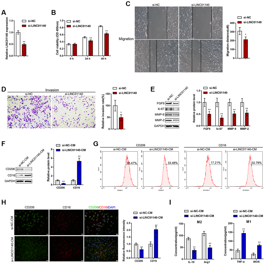 Next, similarly, T24 cells were transfected with si-LINC01140 or si-NC (negative control) and the culture medium (shown in the figures as conditioned medium si-NC-CM and si-LINC01140-CM) was collected for macrophage incubation. M0 macrophages were divided into four groups: IL-4 (M2 polarization inducing) + si-NC-CM, IL-4 (M2 polarization inducing) + si-LINC01140-CM, LPS + IFNγ (M1 polarization inducing) + si-NC-CM, and LPS + IFNγ (M1 polarization inducing) + si-LINC01140-CM. M1/2 polarization markers were then examined. Under M2 polarization conditions, culture with si-LINC01140-CM significantly decreased the protein levels of the M2 marker CD206 while increasing the M1 marker CD16 in macrophages (Figure 4F). Moreover, the flow cytometry results and IF results further confirmed that si- LINC01140-CM decreased the percentage of CD206-positive cells and CD206 in fluorescence intensity while increased the percentage of CD16 positive rate and CD16 fluorescence intensity (Figure 4G and Figure 4H). Moreover, the concentrations of M2 markers IL-10 and Arg1 were significantly decreased, while the concentrations of the M1 markers iNOS and TNF-α were increased in si-LINC01140-CM-treated cells (Figure 4G). These data suggest that LINC01140 might also act as an oncogene in bladder cancer, possibly by affecting bladder cancer cell aggressiveness and macrophage M2 polarization.