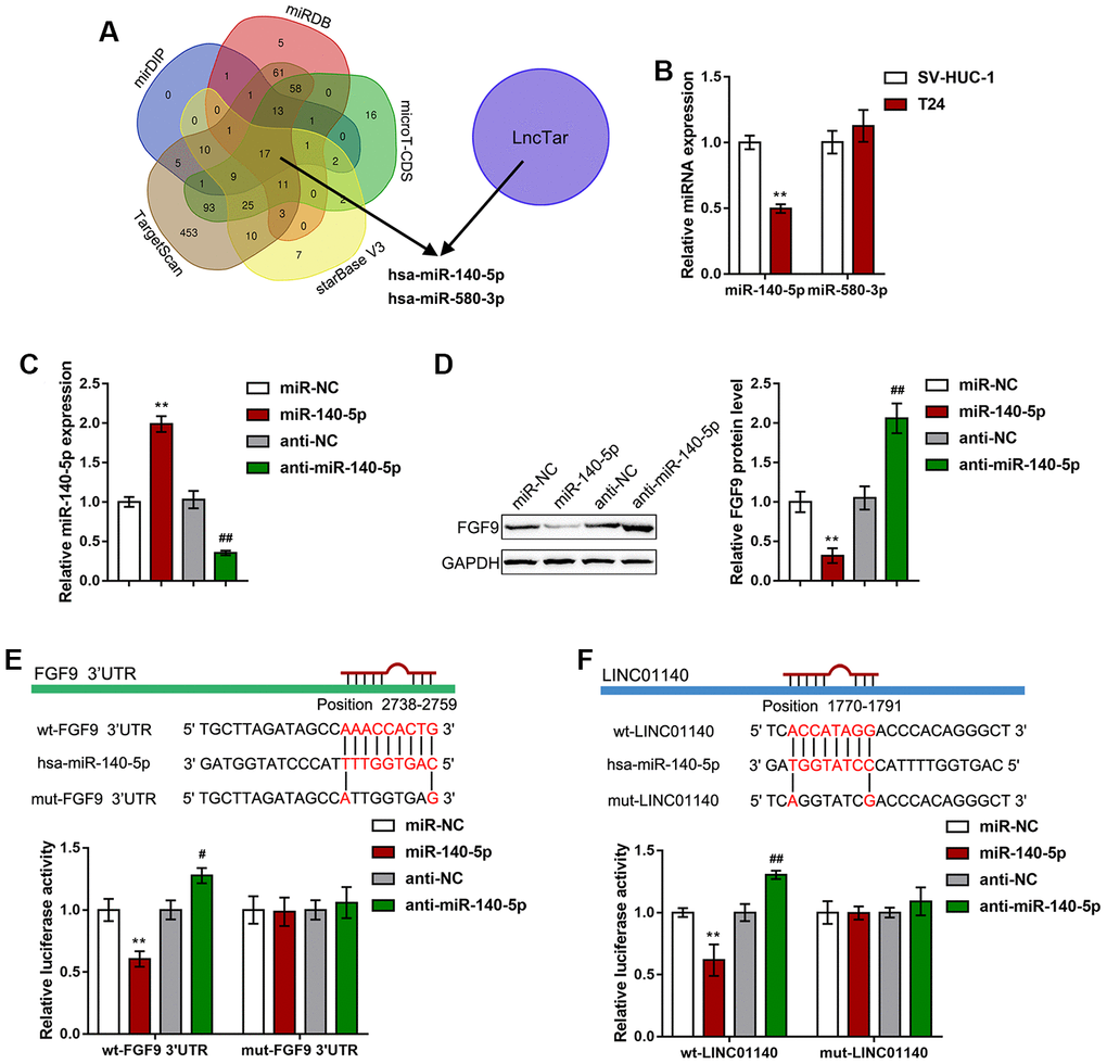 Since lncRNAs can competitively target miRNAs via their MREs (miRNA response elements) to act as ceRNAs (competing endogenous RNAs), thus regulating the expression of downstream target RNAs [40], here, we hypothesized that miRNAs might be involved in the effect of LINC01140 and FGF9 on the aggressiveness of bladder carcinoma cells and macrophage M2 polarization. We used six online tools (mirDIP, TargetScan, starBase V3, microT-CDS, miRDB, and LncTar) to identify miRNAs that might simultaneously target both LINC01140 and the FGF9 3'UTR; we selected two miRNAs, miR-140-5p and miR-580-3p (Figure 5A). Next, we performed real-time PCR to examine miR-140-5p and miR-580-3p expression in both T24 cells and a normal human bladder epithelial cell line, SV-HUC-1; the expression of miR-140-5p was considerably downregulated in T24 cells while miR-580-3p expression showed no significant changes (Figure 5B). Thus, we selected miR-140-5p for further experiments.