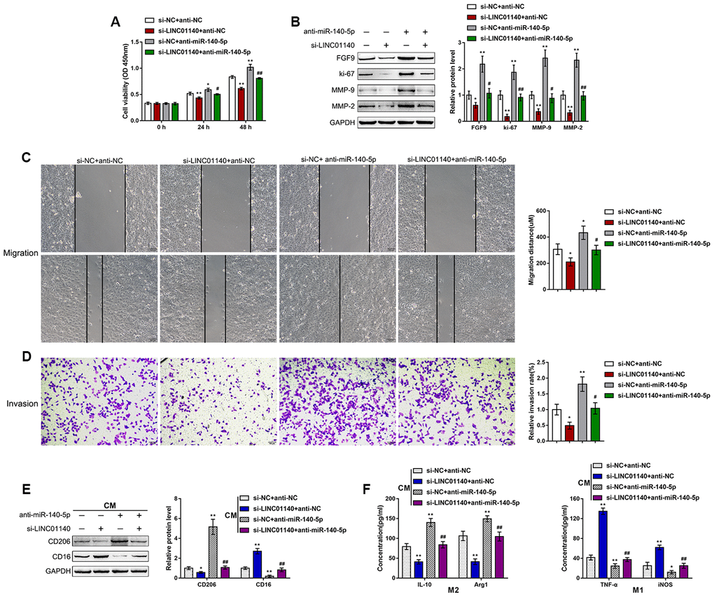 First, we confirmed the binding of miR-140-5p and LINC01140 to the FGF9 3'UTR. Next, we continued to investigate the dynamic effects of LINC01140 and miR-140-5p on FGF9 protein levels and bladder cancer cells. We cotransfected T24 cells with si-LINC01140 and anti-miR-140-5p and then determined the related indexes. LINC01140 knockdown significantly suppressed, whereas the inhibition of miR-140-5p enhanced T24 cell viability (Figure 6A), migration capacity (Figure 6C), and invasive capacity (Figure 6D); the roles of LINC01140 knockdown showed to be significantly reversed via the inhibition of miR-140-5p. Similarly, LINC01140 knockdown significantly suppressed FGF9, ki-67, MMP-2, and MMP-9 protein levels, while the inhibition of miR-140-5p enhanced FGF9, ki-67, MMP-2, and MMP-9 protein levels; the effects of LINC01140 knockdown were significantly reversed by the inhibition of miR-140-5p (Figure 6B). Regarding macrophage M2 polarization, T24 cells were cotransfected with si-LINC01140 and anti-miR-140-5p and the culture medium (shown in the figures as conditioned medium (CM) si-NC + anti-NC, si-LINC01140 + anti-NC, si-NC + anti-miR-140-5p, and si-LINC01140 + anti-miR-140-5p) was collected for macrophage incubation. M0 macrophages were cultured in the above-described four kinds of CMs and polarized to M1 or M2, accordingly. Under M2 polarization conditions, culture in si-LINC01140 + anti-NC CM significantly decreased the expression of the M2 marker CD206 (Figure 6E) and the concentration of IL-10, and Arg1 in the culture media (Figure 6F). In contrast, culture in si-NC + anti-miR-140-5p CM increased M2 marker levels, including CD206 (Figure 6E), IL-10, and Arg1 (Figure 6F). Under M1 polarization conditions, culture in si-LINC01140 + anti-NC CM decreased the M1 markers TNF-α and iNOS (Figure 6F). Notably, under si-LINC01140 + anti-miR-140-5p CM, the effects of LINC01140 knockdown were significantly reversed by the inhibition of miR-140-5p (Figure 6E–6G), indicating that LINC01140 targets miR-140-5p to counteract miR-140-5p-mediated suppression of FGF9, therefore promoting bladder cancer cell aggressiveness and macrophage M2 polarization.