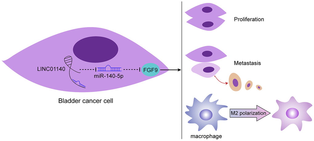 In conclusion, LINC01140, miR-140-5p, and FGF9 form a lncRNA-miRNA-mRNA axis that modulates the bladder cancer phenotype, affects macrophage M2 polarization through the tumor microenvironment, and in turn affects bladder cancer cell aggressiveness (Figure 7). However, the application of this axis needs further in vivo and clinical investigation.