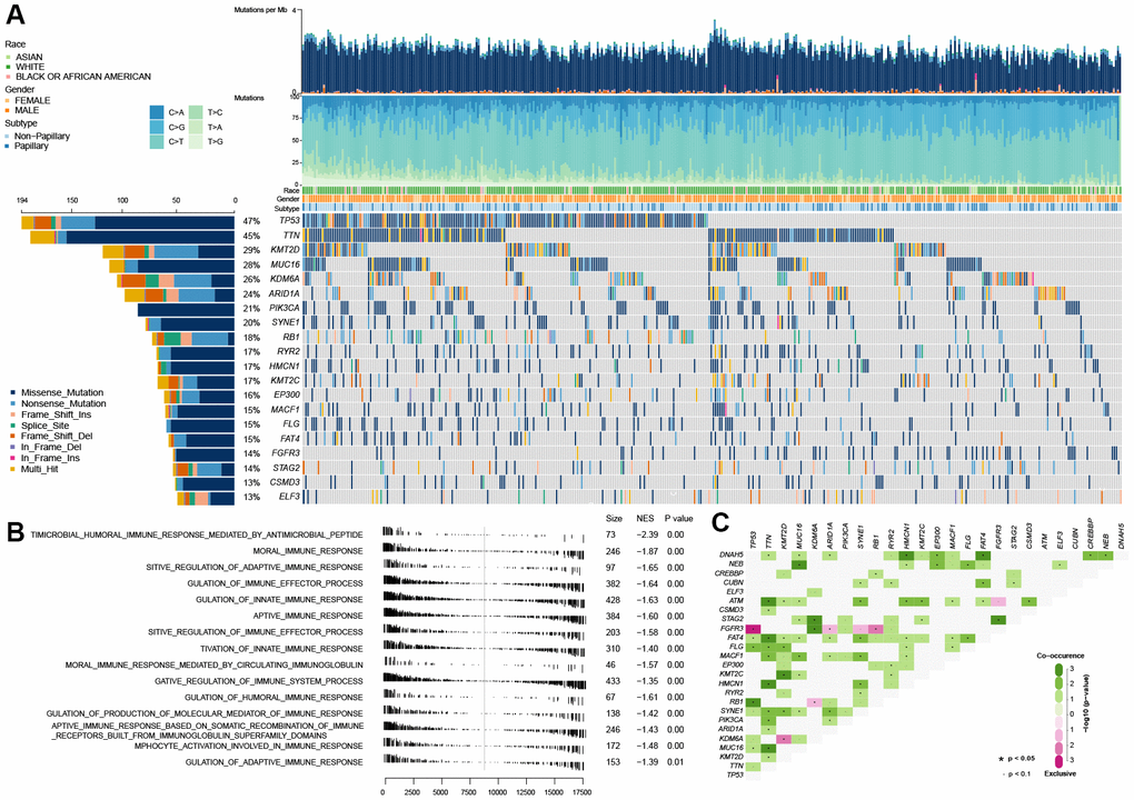 As shown in Figure 1A, TP53 mutation is the universal genetic mutation in MIBC. Although many studies have explored the function of TP53 mutations and found that TP53 was associate with some of the clinical features of bladder cancer, such as grade classification, cancer invasion, recurrence and poor prognosis [14], however, the particular function on immune profiles in MIBC has not been fully elucidated. In this study, we first explored the immune-associated biological processes in MIBC regarding TP53 status using gene expression matrix, somatic mutation data of 407 MIBC samples from the TCGA cohort, and matching clinical data. The patients with (n=194) and without (n=216) TP53 mutations were used to perform gene set enrichment analysis (GSEA). These results indicated that patients from the mutated TP53 group were remarkably enriched in 506 biological processes (BH-adjusted p < 0.05) (Supplementary Table 1). In addition, 15 immune-associated biological processes were fully inhibited in this group (Figure 1B). We also explored the somatic interactions of TP53 (Figure 1C) due to cancers being caused by simultaneous mutations of multiple genes. TP53 co-occurred with FAT4, FLG, and RB1 and were mutually exclusive with FGFR3 in the TCGA MIBC cohort.