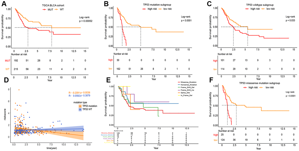 As shown in Figure 3A, the phenotype of TP53 was meaningfully connected with the prognosis of patients with MIBC. To prove the relevance between the prognostic significance of IPM and TP53 status, we performed a classification analysis, separating the TCGA MIBC cohort into two groups based on TP53 status. Classification analysis demonstrated that IPM was significantly associated with OS in wild-type and mutated TP53 groups (Figure 3B, 3C). Moreover, correlation analyses showed that the risk score was significantly positively connected with OS in the wild-type TP53 group and negatively in the mutated TP53 group (Figure 3D). We performed classification analyses of several types of TP53 mutations, and we found that different TP53 mutations affect the prognosis of patients with MIBC (Figure 3E) [10, 18]. To prove the relevance between the prognostic significance of the IPM and TP53 mutations, we performed a predictive analysis of the TP53 missense mutation subgroup, which is the most common type of TP53 mutation. As expected, the TP53 missense mutation was divided into high and low risk groups by IPM (Figure 3F).