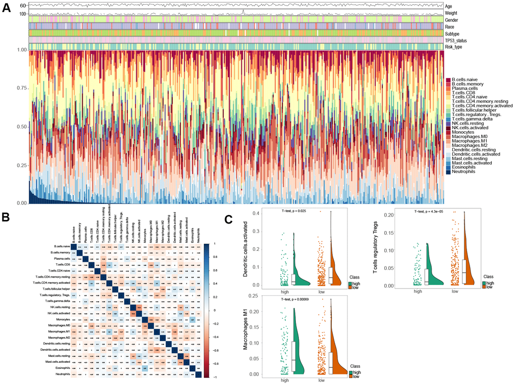 To assess the variation of 22 immune infiltrated cell types between low and high risk MIBC patients, we performed an immune infiltration analysis using CIBERSORT analytical tool with the LM22 signature matrix [19]. The immune landscape of the 407 TCGA MIBC cohort was summarized by representing the proportions of the 22 immune cell types within and between low and high risk groups (Figure 4A). The proportions of diverse subtypes of tumor-infiltrating immune cells were slightly moderately correlated (Figure 4B). The high risk MIBC patients had significantly higher proportions of macrophages M1, while expressively lower proportions of T cells regulatory (Tregs) and activated dendritic cells than the low risk MIBC patients (BH-adjusted p < 0.05) (Figure 4C). Hence, our results indicated that aberrant immune cell infiltration and the heterogeneity of tumor infiltration in MIBC might serve as prognostic indicators and targets for immunotherapy and have significant clinical implications.