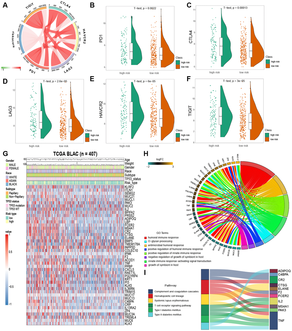 Immune checkpoint inhibition has been a way explored by many novel anti-tumor agents, which have been used successfully in different types of cancer [20]. In bladder cancer, drugs targeting immune checkpoints genes have also been indicated to play anti-cancer function by reversing tumor immunosuppressive effects [21]. Therefore, we estimated the correlation between the risk score of MIBC patients and expression level of vital immune checkpoints genes (PD1, CTLA4, LAG3, HAVCR2 and TIGIT) (Supplementary Table 4). We demonstrated that the risk score of MIBC patients was significantly associated with the expression of PD1, CTLA4, LAG3, HAVCR2 and TIGIT (BH-adjusted p < 0.05) (Figure 5A). Furthermore, we showed that the expression level of PD1, CTLA4, LAG3, HAVCR2 and TIGIT genes in the high risk MIBC subgroup was significantly higher than in the low risk subgroup (BH-adjusted p < 0.01) (Figure 5B–5F). These data suggest that the bleak prognosis of high risk MIBC patients may be partially due to the immunosuppressive microenvironment.