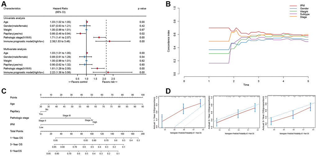 We demonstrated by different approaches that our IPM exhibited better survival prediction than traditional clinical features. Subsequently, we performed a comprehensive evaluation that integrated the IPM with conventional clinical characteristics (age, gender, weight, subtype, and pathological stage). The calibration curve displayed good agreement between the prediction and the clinical characteristics evaluated for 1, 3 and 5 years OS. Our main superiority is that it presents a complementary perspective on individual tumors and establishes a unique scoring method for MIBC patients. Therefore, our nomogram could be used as a promising tool for clinicians in the future.