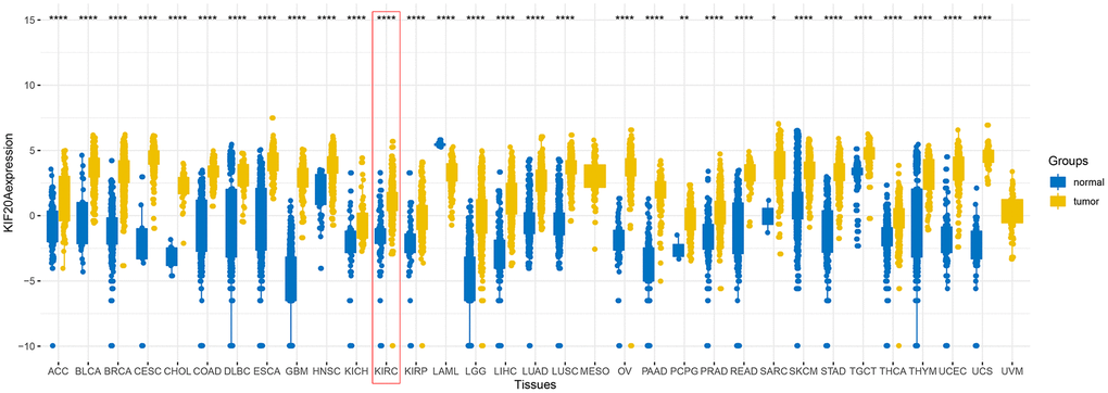 More recently, with increasing focus on the molecular level of ccRCC, a growing body of evidence has indicated that various genes (and related regulatory networks) are crucial for tumorigenesis and cell development [6]. KIF20A, also known as MKLP2 and RAB6KIFL, is located on the chromosome 5q31.2 and encodes a protein consisting of 890 amino acid residues [7]. As a member of the KIF family, KIF20A is mainly distributed in the central region of mitotic spindles and, as such, participated in the processes driving cell division (mitosis) [8]. A number of studies have recently shown a prominent increase on the level of KIF20A expression in varieties of malignancies, including breast, lung, liver, gastric cancers, thus indicating a putative role of KIF20A in cancer development and progression [9–11]. Moreover, KIF20A overexpression appears to be strongly associated with poor prognosis and clinical parameters of tumor patients. Based on immunohistochemistry (IHC) and in vitro analyses, Kawai and colleagues have found that KIF20A may significantly promote the proliferation of ovarian clear-cell carcinoma cells [12]. Xiong and colleagues have also reached some similar conclusions, in which KIF20A can promote the proliferation of colorectal cancer cells via the JAK/STAT3 signaling pathway [13]. Moreover, several studies have noted the underlying importance of KIF20A in immunotherapeutics. Upon performing some genome-wide cDNA microarray analysis in pancreatic cancer, Imai and colleagues have regarded KIF20A as a novel and promising target for anticancer immunotherapy. Their result have demonstrated that KIF20A-2, -8 and -28 might induce HLA-A2-restricted cytotoxic T lymphocytes in HLA-A2 Tgm [14]. Meanwhile, the vaccination with a KIF20A-derived SP may induce a KIF20A-specific CTL response and, therefore, yield promising results in patients affected by advanced cancer [15].